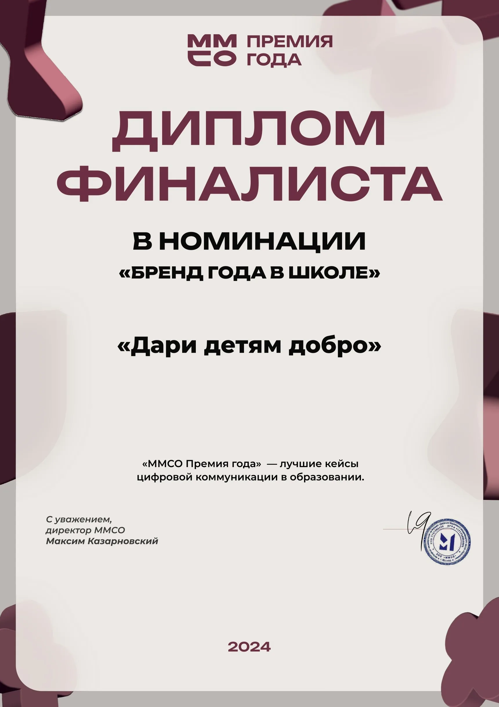 Школа «Дари Детям Добро» вошла в число финалистов в номинации "Бренд года в школе" «ММСО Премия года 2024».